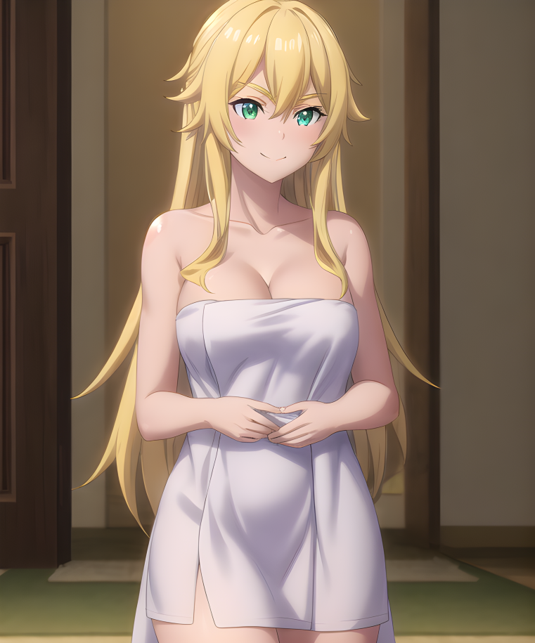 cowboy shot, indoors, smile, 1girl,solo, blonde hair, very long hair, sidelocks, thick eyebrows, hair between eyes, green eyes, collarbone, cleavage, medium breasts, naked towel, barefoot, Exquisite visuals, high-definition, masterpiece,best quality, 18yo, Young female, Beautiful Fingers, Beautiful long legs, Beautiful body,Beautiful Nose,Beautiful character design, perfect eyes, perfect face,expressive eyes,official art,extremely detailed CG unity 8k wallpaper, perfect lighting,Colorful, Bright_Front_face_Lighting,shiny skin,(masterpiece:1.0),(best_quality:1.0), ultra high res,4K,ultra-detailed,photography, 8K, HDR, highres, absurdres:1.2, Kodak portra 400, film grain, blurry background, bokeh:1.2, lens flare, (vibrant_color:1.2), (beautiful_face:1.5),(narrow_waist), ,NSFW,